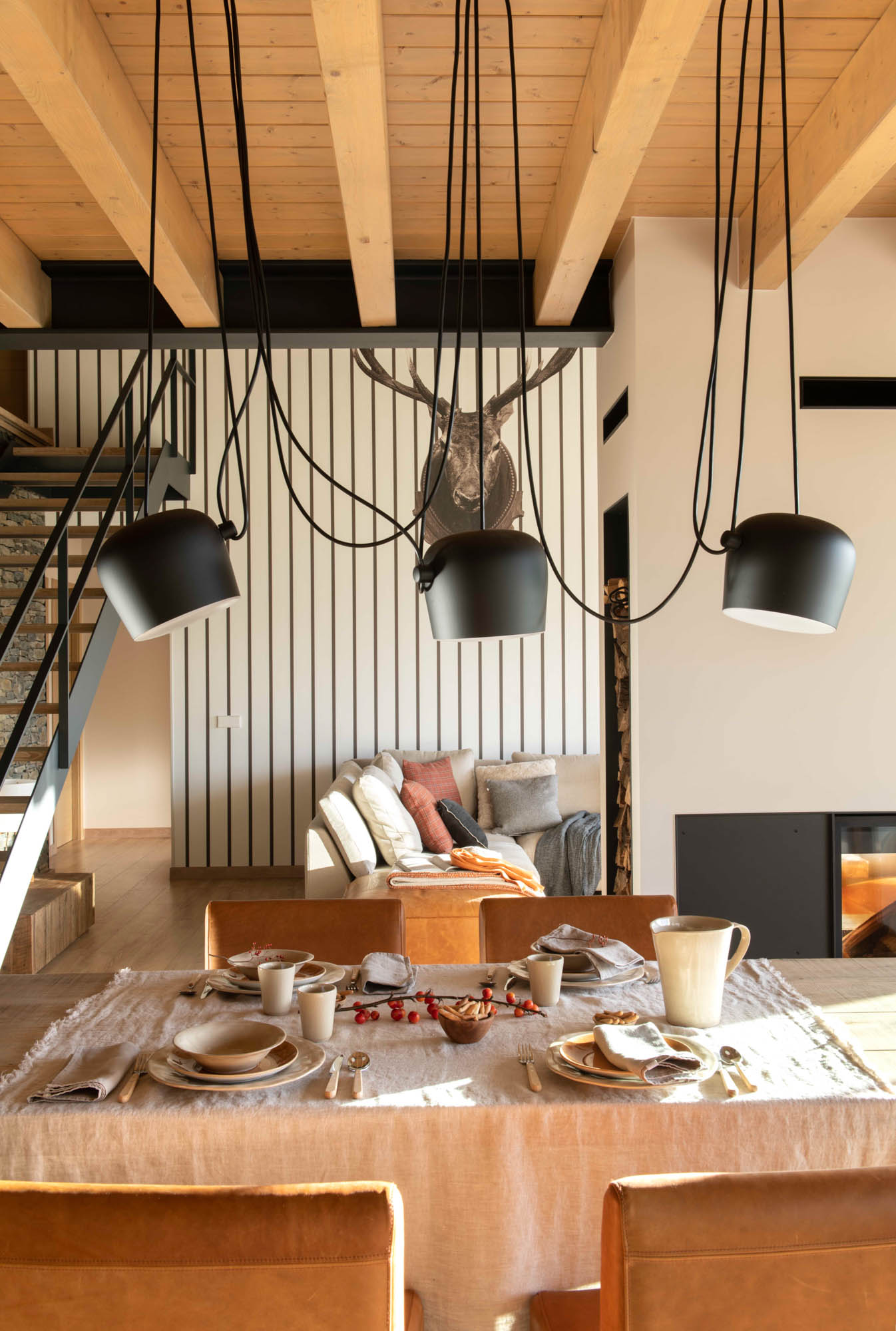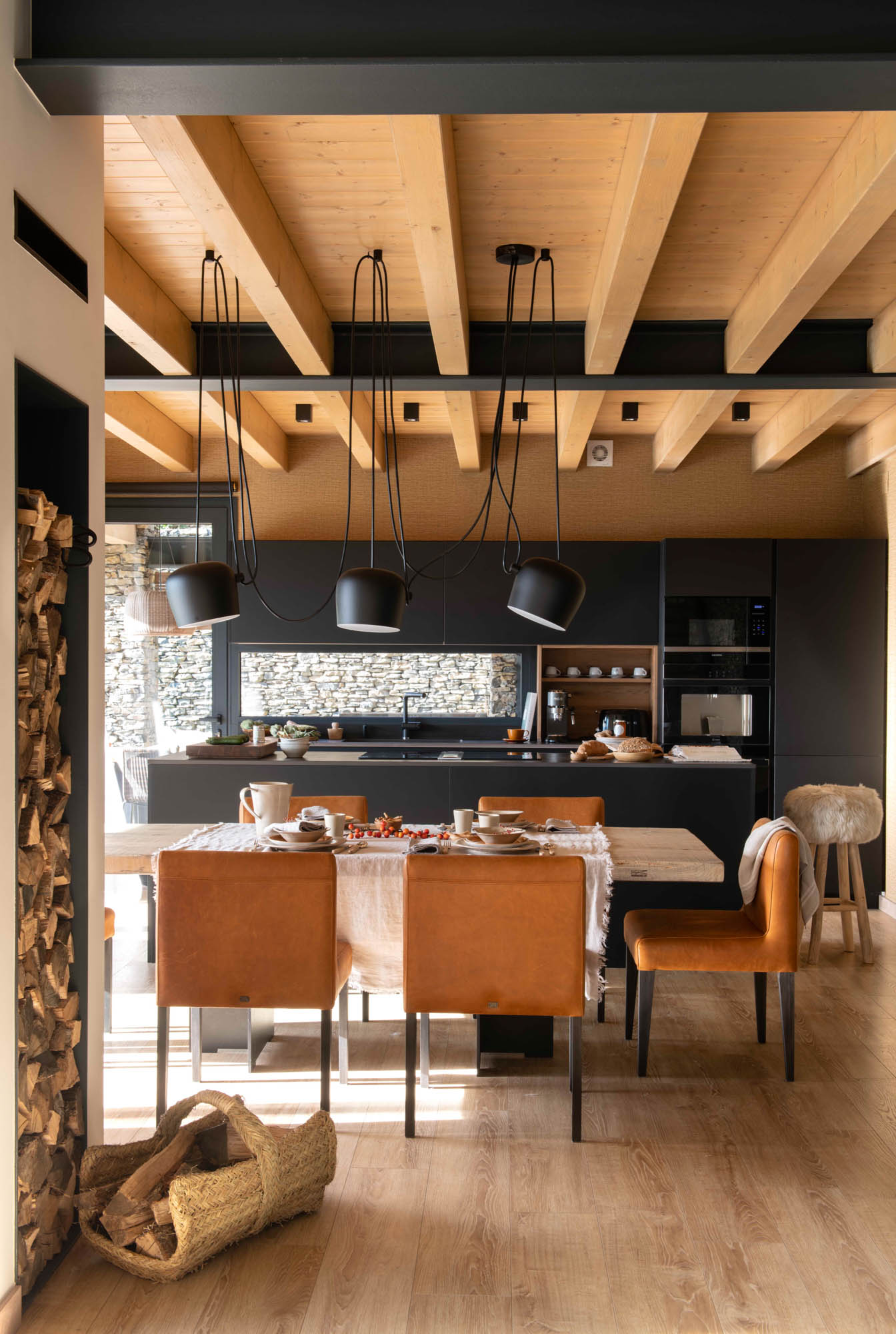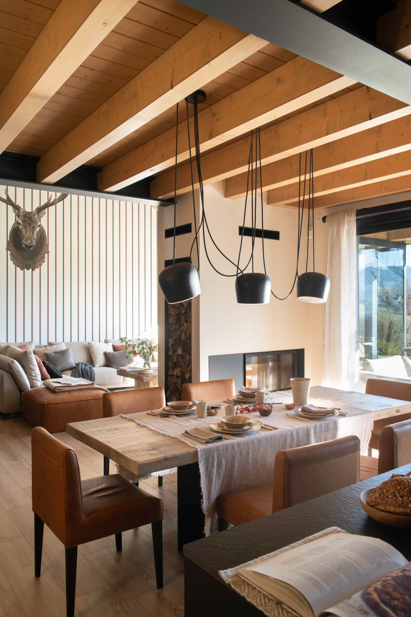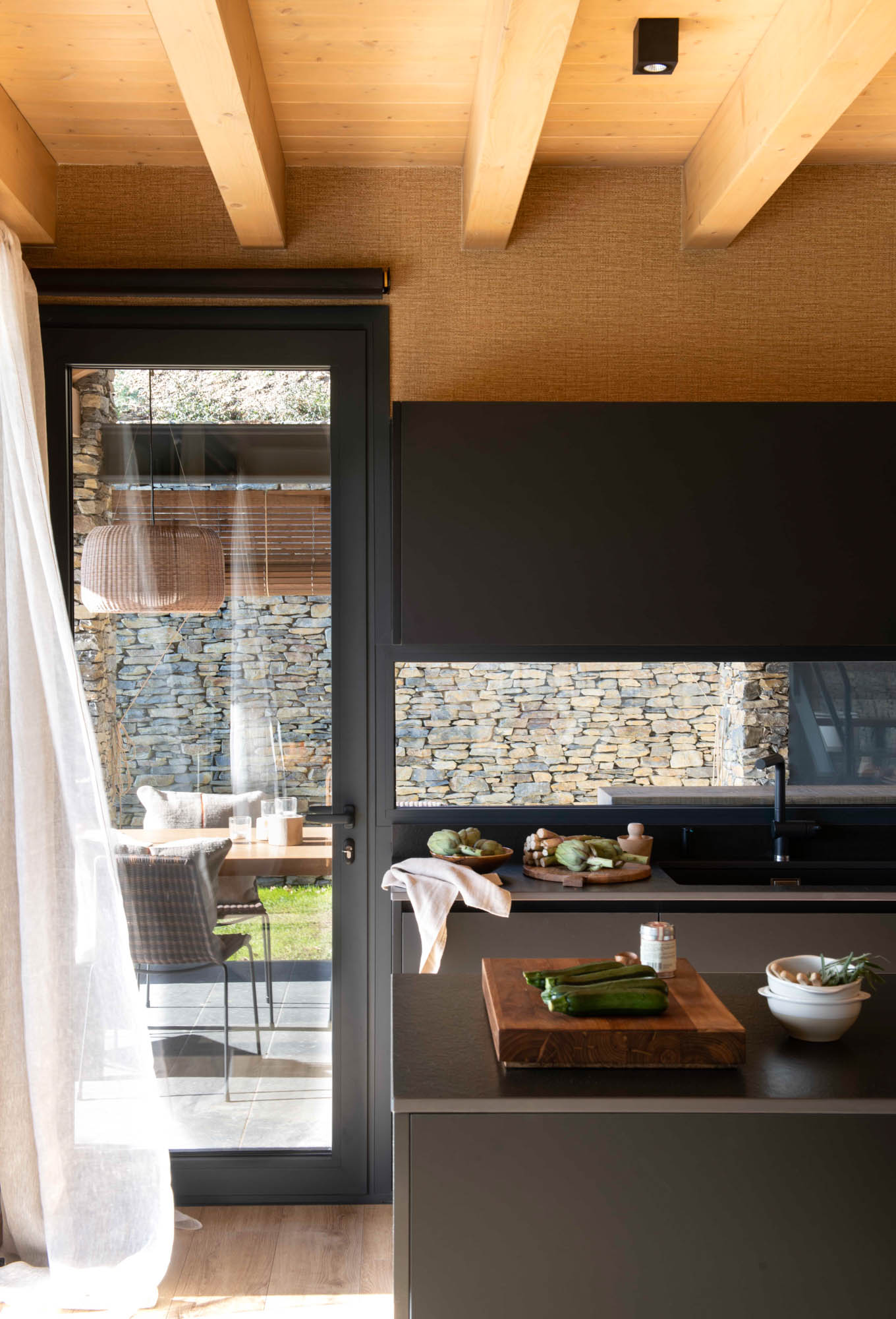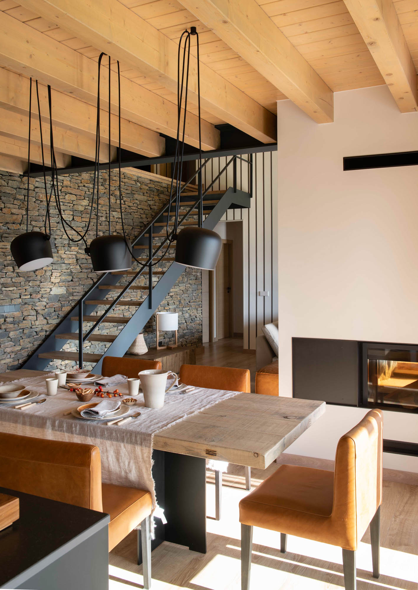 Pensada para disfrutar en familia todo el año, la casa sorprende con una cocina abierta en tonos antracita, integrada al salón con chimenea de doble cara y grandes ventanales que conectan con el paisaje. Los toques industriales, como el hierro o las lámparas negras, contrastan con la calidez de los textiles naturales. En la suite principal, la luz natural entra a través de una ventana interior, creando un baño íntimo con sensación de estar en plena naturaleza. Un hogar funcional, envolvente y personal, hecho para quedarse.