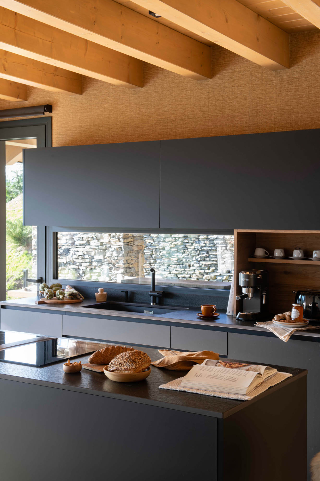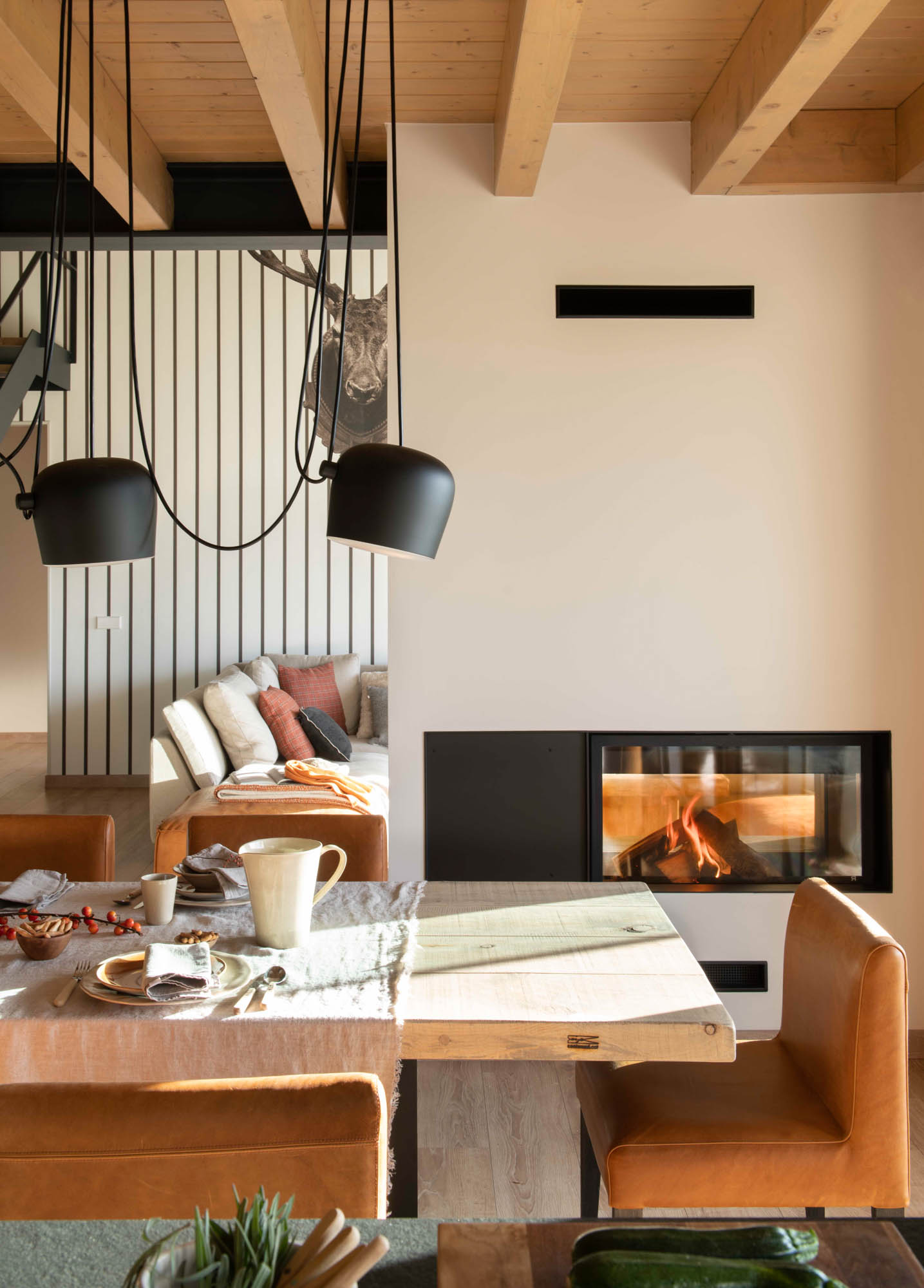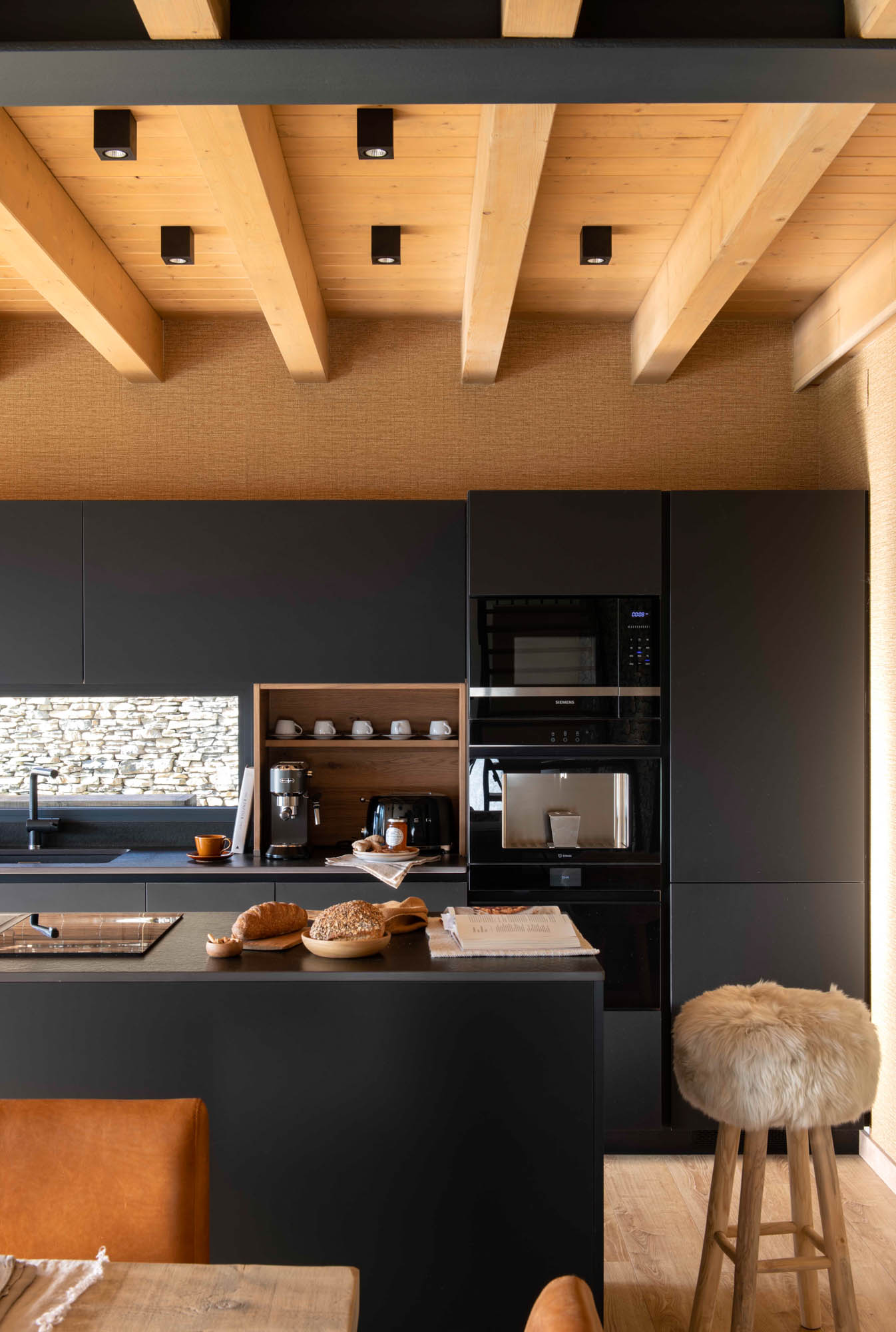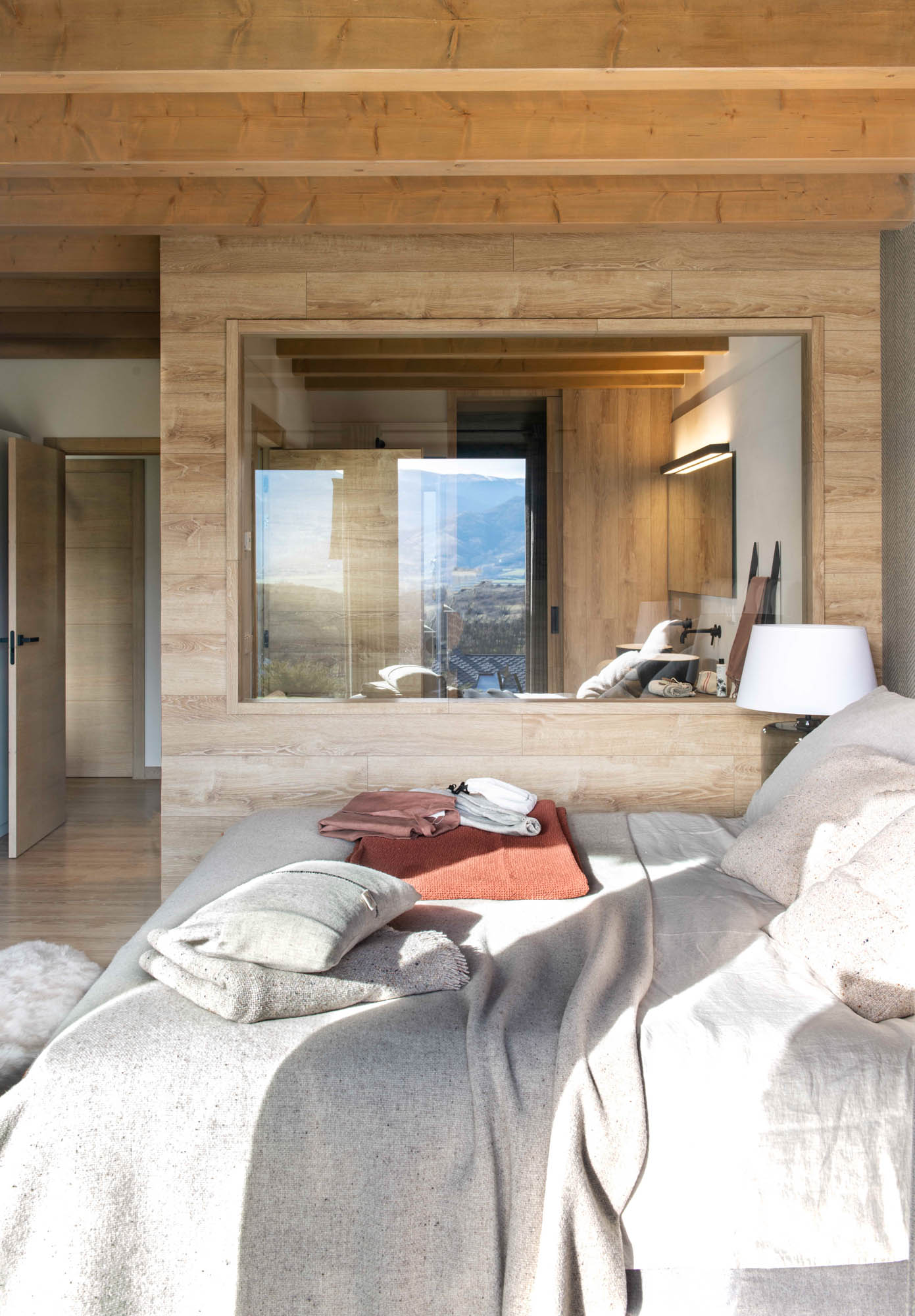 Pensada para disfrutar en familia todo el año, la casa sorprende con una cocina abierta en tonos antracita, integrada al salón con chimenea de doble cara y grandes ventanales que conectan con el paisaje. Los toques industriales, como el hierro o las lámparas negras, contrastan con la calidez de los textiles naturales. En la suite principal, la luz natural entra a través de una ventana interior, creando un baño íntimo con sensación de estar en plena naturaleza. Un hogar funcional, envolvente y personal, hecho para quedarse.
