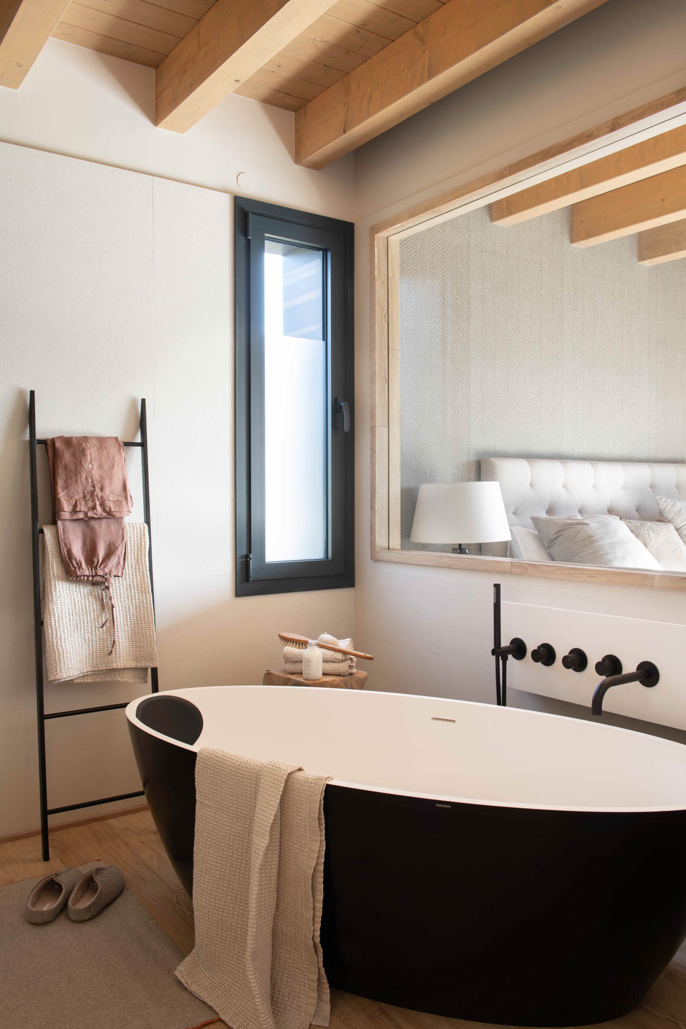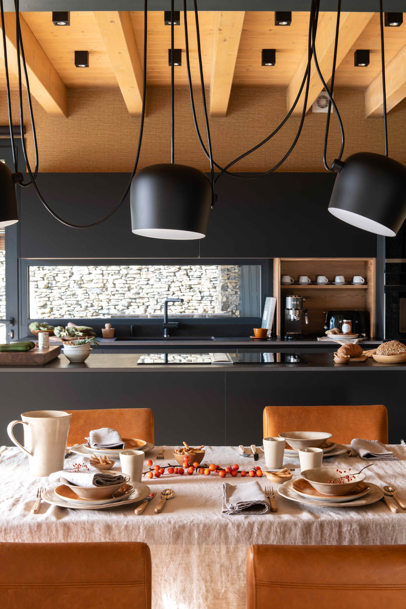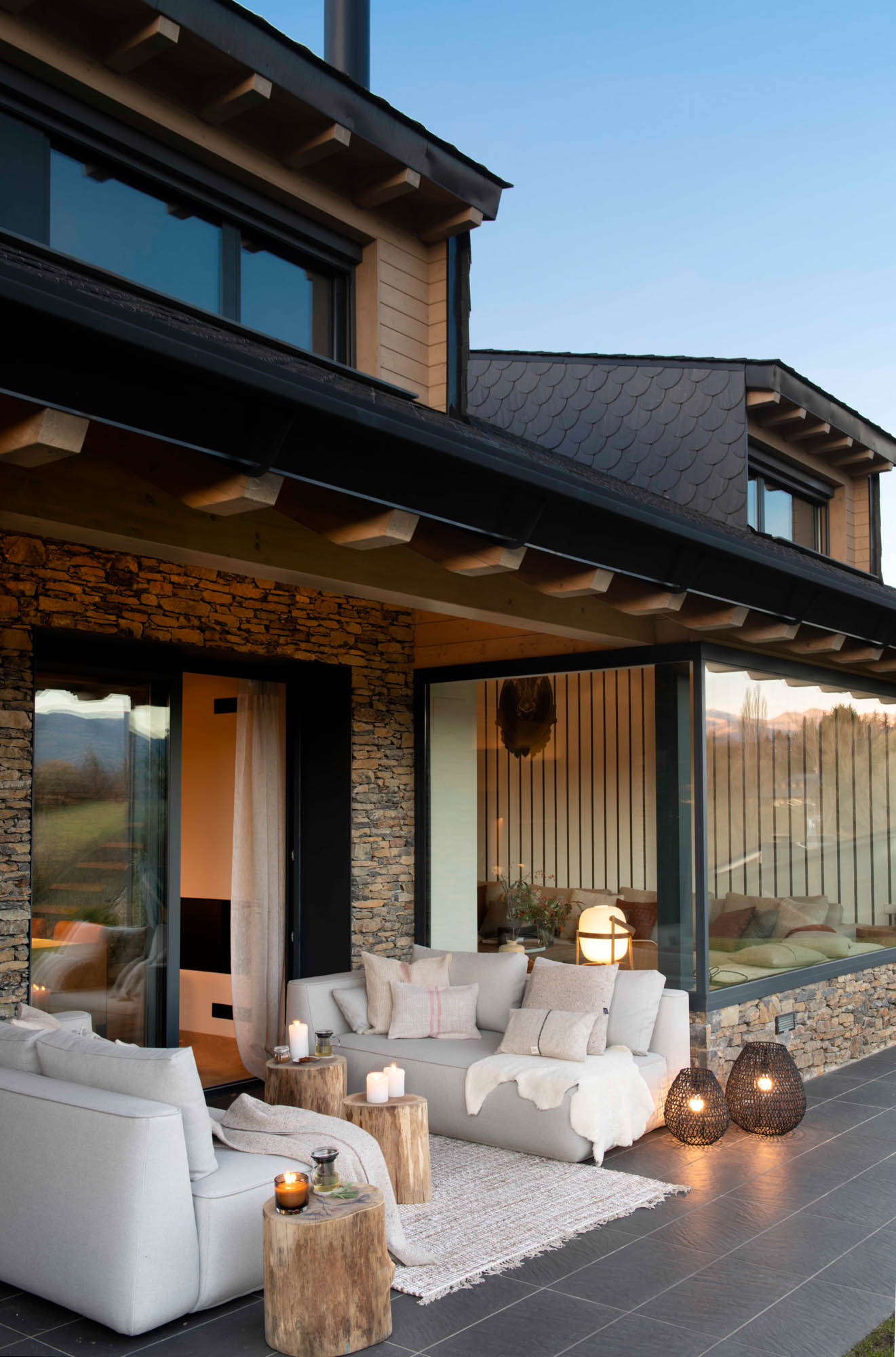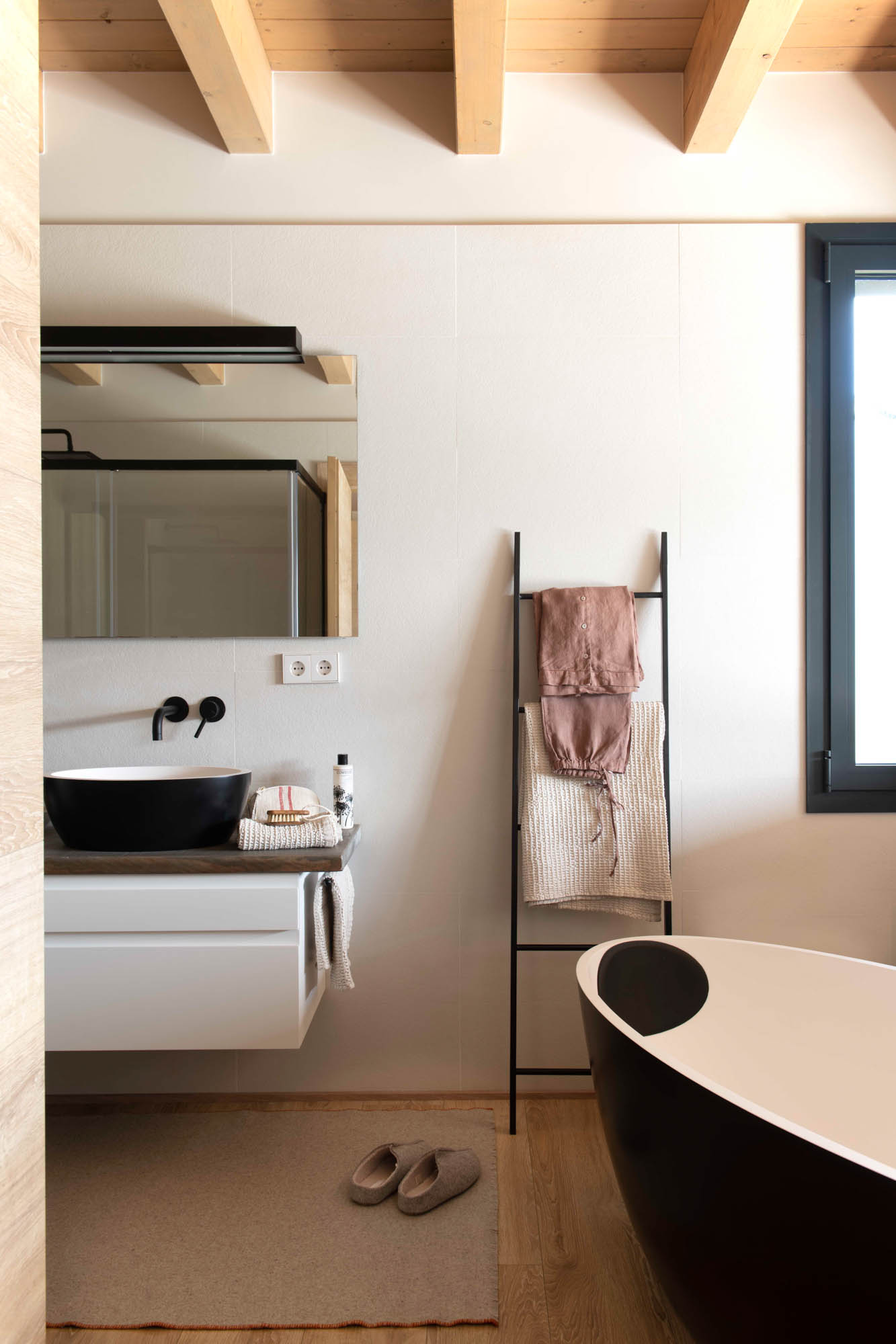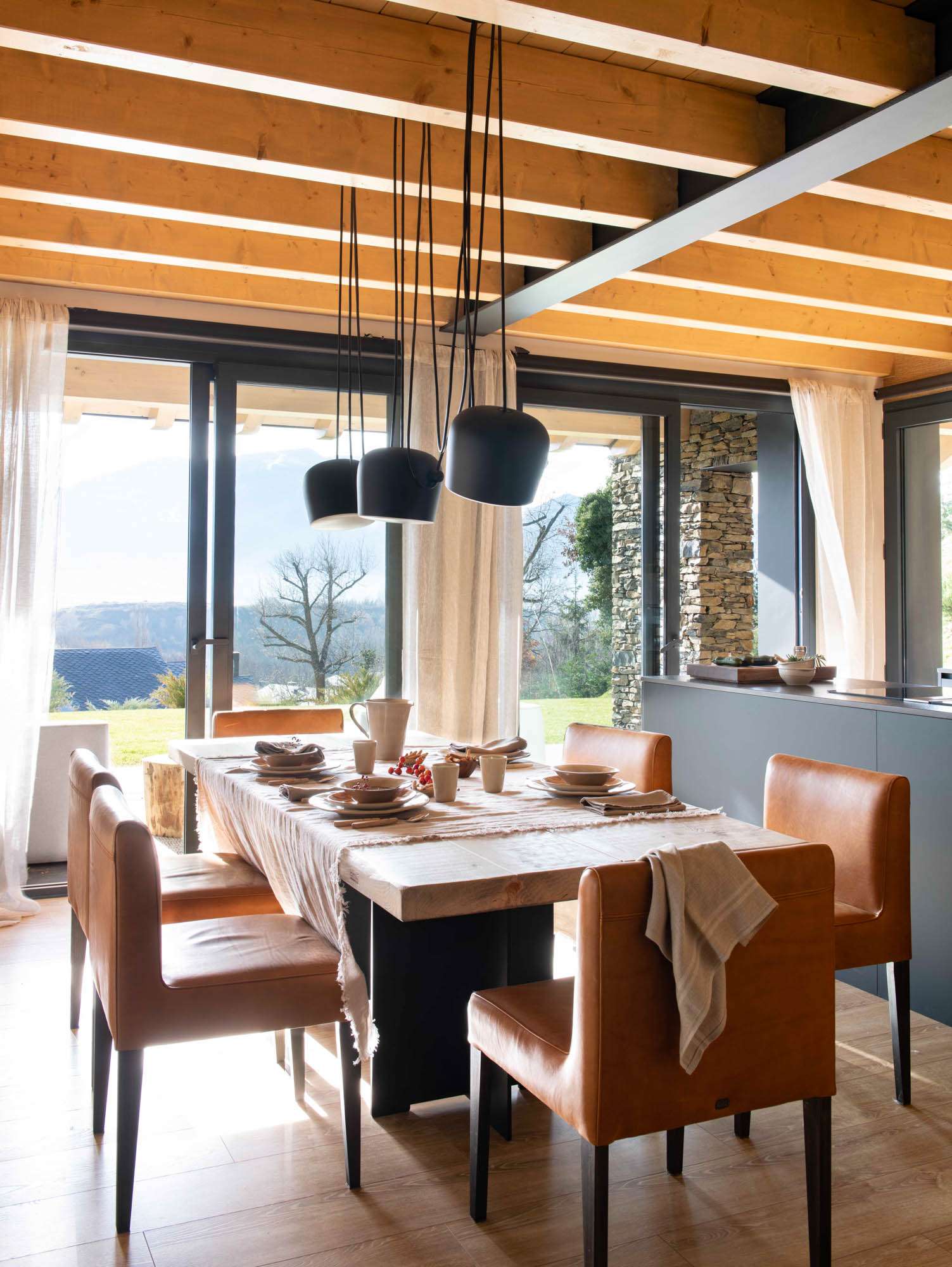 Pensada para disfrutar en familia todo el año, la casa sorprende con una cocina abierta en tonos antracita, integrada al salón con chimenea de doble cara y grandes ventanales que conectan con el paisaje. Los toques industriales, como el hierro o las lámparas negras, contrastan con la calidez de los textiles naturales. En la suite principal, la luz natural entra a través de una ventana interior, creando un baño íntimo con sensación de estar en plena naturaleza. Un hogar funcional, envolvente y personal, hecho para quedarse.
